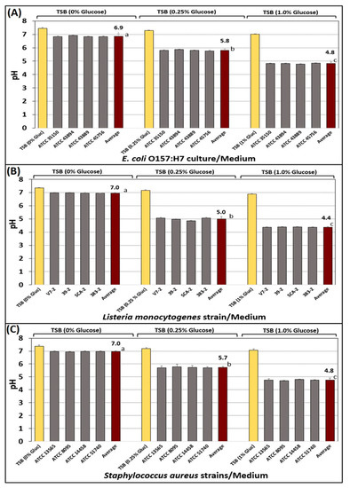 Response of various strains of E. coli O157:H7, L. monocytogenes, and S. aureus when grown in TSB medium at various glucose concentration (0%, 0.25%, 1.0%) at 37 °C (S. aureus, E. coli O157:H7) or 30 oC (L. monocytogenes): (A) E. coli O157:H7 (ATCC 35150, 41894, 43889, 45756); (B) L. monocytogenes (V7-2, 39-2, SCA-2, 383-2); (C) S. aureus (ATCC 8095, 13565, 14458, 51740). The values of the average pH for each set of 4 strains is listed above the average graph bar. Data are presented as the mean of triplicate replications and error bars represent the standard deviation from the mean. Means (for average pH) with different letters are significantly different as determined by one-way ANOVA using the Holm–Sidak test for pairwise multiple comparisons to determine significant differences (p < 0.05); means with different letters are significantly different (p < 0.05).