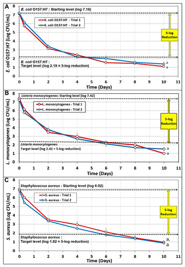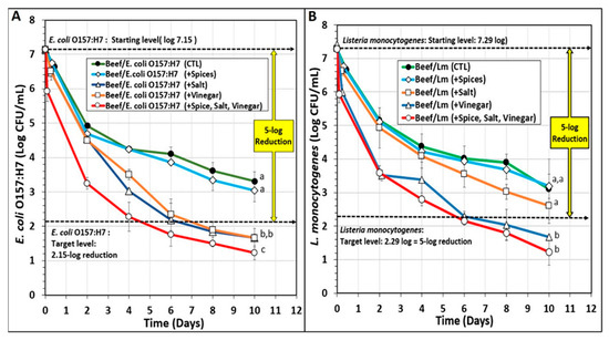 Each trial in this study was performed in duplicate replication with 3 samples tested per sampling period within each trial (n = 6) in accordance with validation testing criteria established by the NACMCF [28] and accepted by USDA-FSIS [29]. All replications were performed as autonomous and separate experiments using separately inoculated cultures and meat from different animals. Data are presented as the mean of multiple replications with standard deviation of the mean represented by error bars. Statistical analysis was performed using the statistics functions in Sigma-Plot ver. 13 (Systat Software, San Jose, CA, USA). Timed data series were statistically analyzed by repeated measures one-way analysis of variance (RM-ANOVA) using the Holm–Sidak test for pairwise multiple comparisons to determine significant differences (p < 0.05) between treatments. Data treatments with different letters are significantly different (p < 0.05); treatments with the same letter are not significantly different (p > 0.05).