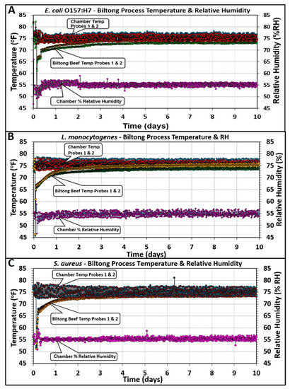 Temperature (°F) and relative humidity (% RH) oven conditions with (A) E. coli O157:H7, (B) L. monocytogenes, and (C) S. aureus inoculated beef during biltong processing. The temperature and humidity range observed were 75 ± 2.5 °F (23.9 ± 1.4 °C) and 55% ± 1.5% RH, respectively.