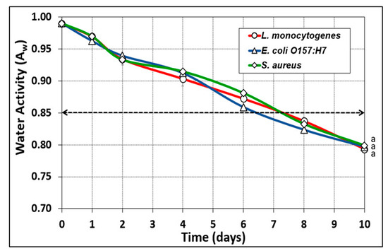 Water activity (Aw) from interior portions of biltong beef during trials with E. coli O157:H7, L. monocytogenes, or S. aureus, held at 23.9 °C (75 °F) and 55% RH for up to 10 days. Repeated measures one-way analysis of variance (RM-ANOVA) using the Holm––Sidak test for pairwise multiple comparisons to determine significant differences (p < 0.05); treatments with the same letter are not significantly different (p > 0.05).