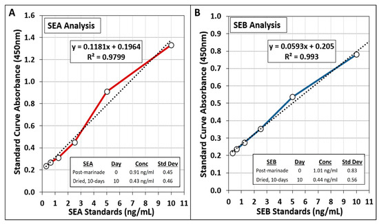 Analysis of (A) SEA and (B) SEB from S. aureus-inoculated biltong beef after rinse/marinade treatment (Day 0, initial measurement) and after 10 days of drying (latter measurement) using staphylococcal enterotoxin ELISA quantification kit. Graphs show standard curve plot and SEA and SEB analyses of inoculated samples post-marinade and post-dried (10 day) samples. Beef sample enterotoxin data levels were derived from assay absorbance and quantified from the equation obtained for the standard curve trend line (n = 4).