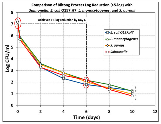 Comparison microbial lethality of a basic biltong process for >5-log reduction of Salmonella (adapted from [10]), E. coli O157:H7, L. monocytogenes, and S. aureus (this study). The data represent the average of 2 separate trials, each performed with triplicate sampling at each sampling point (combined, n = 6 for each sampling period). Treatments were analyzed by repeated measures one-way analysis of variance (RM-ANOVA) using the Holm–Sidak test for pairwise multiple comparisons to determine significant differences (p < 0.05) of treatment; treatments with the same letters are not significantly different (p > 0.05).