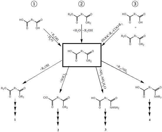 Synthesis of aliphatic monoesters by esterification, selective monohydrolysis, and transesterification, and the following reactions for which monoesters are used [,,,,,,]. 1, 2, 3 and 4 are described in Table 1.