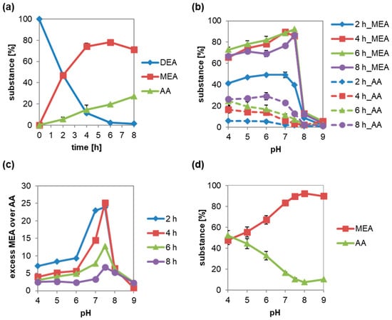 MEA hydrolyzed only at a pH lower than 8 by ACut2-6hp culture supernatant, which confirms previous results (Figure 2d). The highest AA concentration of 42% was formed at pH 4, decreasing slowly to 2% with the increase to pH 7.5. The inhibition of MEA hydrolysis at pH 7.5 explains the high MEA yields at pH 7.5 if DEA is hydrolyzed.