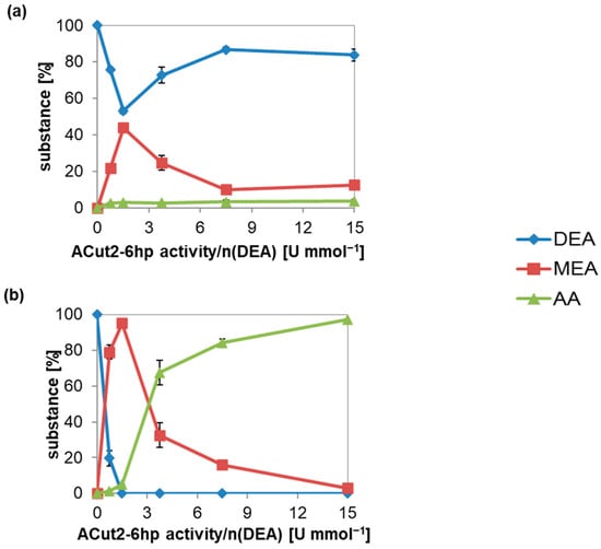 Although the DEA hydrolysis was fastest with 1.5 U mmol−1 ACut2-6hp, only minimal AA was found after 16 h (Figure 3b); up to 95% MEA and only 4.9% AA were synthesized. Higher enzyme activities promoted the synthesis of the unwanted diacid AA, which was formed up to 97% in 16 h when 15 U mmol−1 cutinase activity was used.