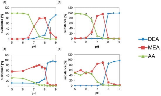 Immobilization at pH 5 to 9 in sodium phosphate buffer pH 7.5 at 30 °C was chosen for hydrolysis (Figure 4a,b). Incubation at pH 5 to 6.5 for adsorption or pH 5 to 6 for covalent bonding gave nearly 100% AA. Afterwards, MEA concentration increased up to 80% at pH 7.5–8 with 4% AA, or 96% at pH 7.5 with 3% AA. DEA is only slightly hydrolyzed if pH is over 8.5 or 8.