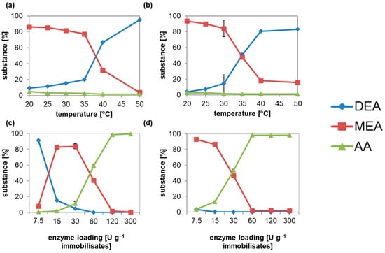 Minimization of AA formation in DEA hydrolysis catalyzed by ACut2-6hp adsorbed (a,c) or covalently bonded (b,d) in dependence of temperature during reaction (a,b) and enzyme loading (c,d). The activity of 7.5 U g−1 corresponds to 1 mg protein g−1 carrier of ACut2-6hp. Measurements were made in duplicate. Represented are the mean ± SD.