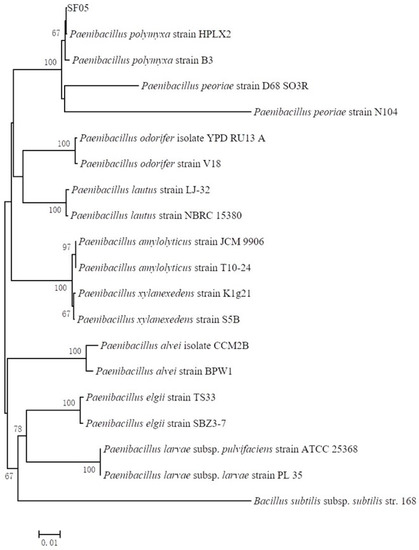 After continuous culture for purification, a strain with steady and strong antimicrobial activity was isolated and named SF05 (CCTCC NO: M2020384). The sequence of 16S rDNA was amplified by the primers of 16sF/R and was uploaded to the National Center for Biotechnology Information (NCBI, https://www.ncbi.nlm.nih.gov/, accessed on 3 October 2021) (GenBank: MT820612.1). The alignment results showed that the identities of 16S rDNA and P. polymyxa reached 99%, and strain SF05 was in one branch in the phylogenetic tree based on the sequences of 16S rDNA of the Paenibacillus genus (Figure 1). The results suggested that antagonist bacterium strain SF05 belonged to Paenibacillus genus and might be P. polymyxa.
