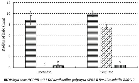 Pectinase and cellulase activities of D. zeae NCPPB 3531, P. polymyxa strain SF05 and B. subtilis BS0512. Different lowercase letters denote significant differences (p < 0.05).