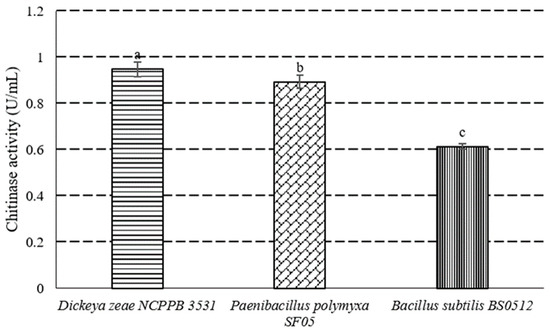 Chitinase activity of D. zeae NCPPB 3531, P. polymyxa strain SF05, B. subtilis BS0512. Different lowercase letters denote significant differences (p < 0.05).