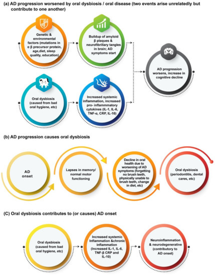 It has been established that, generally, Alzheimer’s Disease can lead to oral dysbiosis—there is much evidence suggesting that Alzheimer’s patients naturally experience a decline in oral health after disease onset compared to healthy individuals [43]. By the disease’s nature, a decline in motor movement is observed, including a decline in mouth movement and in the limbs required to maintain oral health, such as brushing teeth. Therefore, the likelihood of developing caries and periodontitis in AD increases as a decline in oral health maintenance leaves more opportunities for the overgrowth of harmful microbes in the mouth [37].