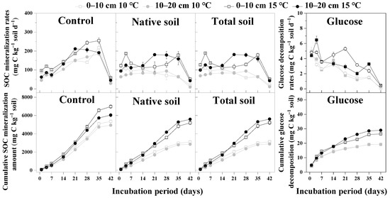 Warming by 5 °C increased the SOC mineralization rates and the cumulative amount during 42 days of incubation in 0–10 and 10–20 cm soil layers both with or without glucose addition treatment (Figure 1). Total cumulative native SOC mineralization amount of 42 days incubation in 0–10 and 10–20 cm soil layers at 15 °C, respectively, increased by 1623.96 and 1112.31 mg C kg−1 at 10 °C, and increased 2084.31 and 2732.01 mg C kg−1, respectively, under glucose (Figure 1).