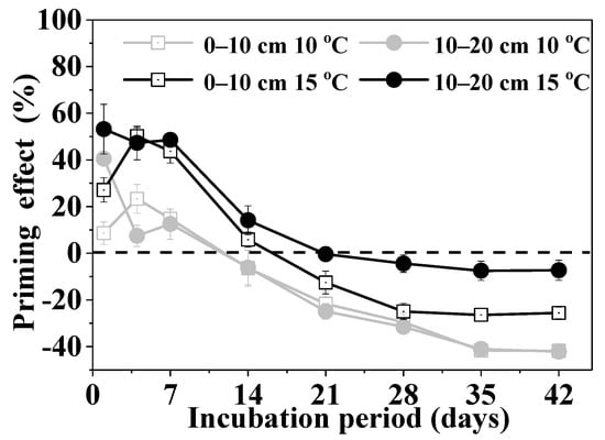 However, the mechanism of the subsequent negative PE was relatively elusive. It was likely that multiple mechanisms coexist, and the mechanisms may vary with different soil layers and temperatures. It is known that the fate of glucose is usually determined by respired carbon, microbial biomass, DOC, and SOC, and that the microbial immobilization of glucose out-competes physico-chemical sorption in soil [56]. The amount of added glucose was equivalent to 400 mg C kg−1 dry soil in our experiment, but the glucose-derived carbon losses through CO2 release during incubation was only approximately 19.16–28.95 mg C kg−1, and the increment of DOC contents was only 160 mg kg−1 at most. Given that glucose can effectively incorporate into microbial biomass [64], the other part of glucose was likely to enter the body of microorganisms or be polymerized by microorganisms into recalcitrant SOC and fixed to the soil. A previous study supporting our view was that under the condition of low concentrations, glucose-derived carbon was stored in a transitional pool (metabolic arrest) and not decomposed to CO2 [65]. Additionally, Hopkins et al. [66] found that the added glucose may be transformed into microbial residues with various complexities in chemical structure. Moreover, Yuan et al. [67] observed that glucose addition resulted in a net C accumulation, which challenged the assumption that glucose serves as a co-metabolite in driving SOM decomposition to lose C.