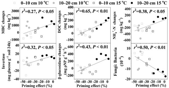Finally, regardless of the mechanisms implied, our linear regression analysis showed that the final PE had a significant positive relationship with the changes of MBC, DOC, and NH4+-N contents, and invertase and β-glucosidase activities under glucose addition, and had a significant negative relationship with the changes in the fungi: bacteria ratio, suggesting that glucose addition may control the direction and intensity of the priming effect by affecting the soil active carbon and available nitrogen contents, carbon cycle-related enzyme activities, as well as microbial community structure. This conclusion supported our above conjecture about why the PE direction switched from positive to negative. Consistent with our findings, Qiu et al. [69] found that the PE induced by the input of labile organic carbon was regulated by the soil available nitrogen and Xiao et al. [70] also found that the PE linearly correlated with the MBC response to exogenous carbon input. Besides, a previous meta-analysis demonstrated that the direction and magnitude of the PE depended on the ratio of the added substrate amount to the size of the MBC, when the added amount of available organic carbon was higher than 50% of the microbial biomass carbon, an exponential decrease in the PE or even a switch to negative values was always observed [26]. Here, the added glucose amount was equivalent to 28.49% (in 0–10 cm) and 27.39% (in 10–20 cm) of MBC, thus broadening the range of the added glucose concentration that may lead to a negative PE.