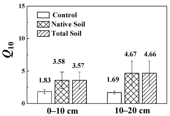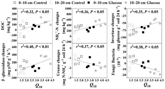 Q10 values in 0–10 cm soil layers with or without glucose addition were 3.57 (native soil is 3.58) and 1.83, respectively, while in 10–20 cm they were 4.66 (native soil is 4.67) and 1.69, respectively (Figure 4). Glucose addition increased the temperature sensitivities of SOC mineralization in both soil layers. The Q10 value was significantly positively correlated with the changes in DOC and NH4+-N contents, as well as invertase and β-glucosidase activities after 5 °C of warming, but significantly negatively correlated with the changes in urease activity and the fungi: bacteria ratio (Figure 5).