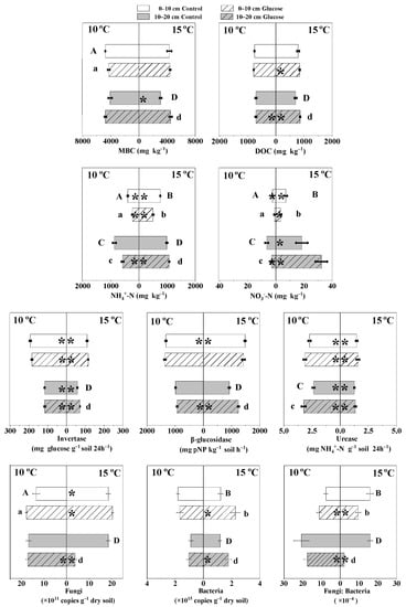 MBC contents in 0–10 and 10–20 cm soil layers at 15 °C, respectively, decreased 462.08 and 1030.14 mg kg−1 at 10 °C under the control, while increased 117.09 mg kg−1 in 0–10 cm and decreased 281.25 mg kg−1 in 10–20 cm under glucose addition (Figure 6). Warming by 5 °C had no significant effect on DOC contents with the control, but significantly increased DOC contents with glucose addition in both soil layers.