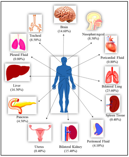 In total, 246 organ samples, which includes nasopharynx, bilateral lungs, pancreas, bilateral kidneys, liver, spleen, brain, uterus, peritoneal fluid, and pericardial fluid, from 21 dead bodies were collected in the VTM vials. The samples were then packed and transported to the Department of Microbiology, AIIMS—Bhopal and stored at −80 °C until further processing. Autopsied samples from lungs, liver and kidney tissues were also subjected to determine histopathological changes, if any. The interested readers can refer [33] for clinical and histopathological findings.