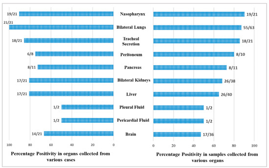 A total of 246 samples from various vital organs were collected during autopsy and their RT-PCR results shows that the SARS-CoV-2 was detected from all organs. The percentage positivity diagnosed by RT-PCR of autopsied specimen collected from 21 cases is illustrated in Figure 2. The bar chart on the right represents percentage positivity of the organs and on the left depict the number of cases in which the organs were positive for the present of SARS-CoV-2 RNA. For SARS-CoV-2 infection, as it is primarily responsible for causing respiratory illness, the highest detection was expectedly observed in nasopharyngeal samples (90.5%) followed by lungs (87.3%) and trachea (85.7%). SARS-CoV-2 was detected in peritoneal (80%), pancreas (72.7%), kidney (68.4%), and liver (65%) samples, and also could pass the blood–brain barrier, seen in nearly 50% of the samples. Of the total 21 cases autopsied and studied, the presence of SARS-CoV-2 was seen in lungs for all the cases, liver for 17 cases, in pancreas for 8 cases, in peritoneal fluid for 6 cases, and in brain for 14 cases.