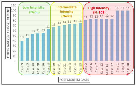 The 21 cases were further classified into high-, medium-, and low-intensity infection based on the number of organs involved Figure 3. Organ involvement was determined as the percentage of organs tested positive for SARS-CoV-2 infection by RT-PCR out of total number of samples collected from that autopsied case. As per equation below, the organ involvement for all 12 organs studied was calculated for each case. The minimum and maximum percentage organ involvement of autopsied case for SARS-CoV-2 were 40% and 100%, respectively. For internal comparison, cases with <65%, 65–80% and >80% positivity were designated as ‘low’-, ‘intermediate’- and ‘high’-intensity organ involvement, respectively. There is no precedence available in published scientific literature for classifying SARS-CoV-2 patients’ in high-, intermediate- and low-intensity organ involvement based on the number of organs involved, because the insights to unprecedented SARS-CoV-2 infection are still evolving and our study is amongst very few, and is the only study to emerge from Indian sub-continent, which aimed to demonstrate the dissemination of SARS-CoV-2 from lungs to other vital organs. Therefore, this can serve as a reasonable reference analysis tool in future autopsy studies.