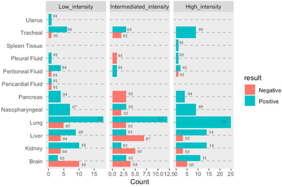 In total, 246 samples, which included samples from nasopharynx, bilateral lungs, trachea, peritoneum, pancreas, bilateral kidney, liver, brain, pericardium, pleura, spleen, and uterus, were collected from 21 cases and studied. For some organs such as brain, lungs and liver, samples were collected from multiple sites from the same case. The qRT-PCR assay was positive for 181 (73.57%) samples while 65 (26.42%) were negative Figure 1.