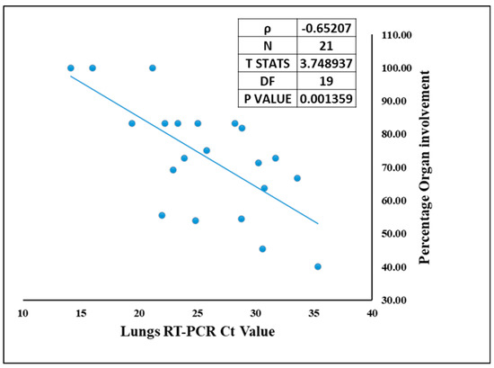 Though COVID-19 is associated with the respiratory system, we demonstrate presence of SARS-CoV-2 other vital organs as well. The site of lodgment for SARS-CoV-2 is nasopharynx, which being contiguous to lungs makes them the primary target organ, and lungs were the only organ from which SARS-CoV-2 was detected by RT-PCR in all 21 autopsied cases. Hence, correlation could be drawn only between the Ct value of SARS-CoV-2 in lungs and organ involvement. The organotropism associated with this infection is a direct function of the viral load in the lungs. This means that higher the viral load in the lungs (lower Ct value), the more the infection will spread in other extrapulmonary organs [37]. Therefore, the percentage of organ involvement for each case was correlated with viral RNA in the lungs (lungs qRT-PCR Ct value) Figure 6. Spearman’s rank correlation test showed a negative correlation of −0.65 with T statistics of 3.74 and significant p value of 0.0013. This suggests that higher pulmonary viral RNA (i.e., lower Ct value) corresponds to high percentage of organ involvement, contributing to the broad virus dissemination in case of SARS-CoV-2.