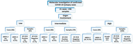For all the recruited cases, the data for ARDS category was assigned at the time of admission. The detailed distribution of the study cases based on organ involvement along with their ARDS categorization and qRT-PCR results is illustrated in Figure 7. Duration of the survival and ARDS category were also documented for all the 21 cases. Among all these cases, only one was declared brought dead (Case No.10) to the hospital, whereas the remaining 20 cases were admitted to the COVID-19 Intensive Care Units of AIIMS—Bhopal, Madhya Pradesh (India). Mean survival days for the study cases was 9.2 days. The highest hospital occupancy was seen for Case 5, which was 39 days, and the case belonged to the subgroup of low-intensity organ involvement. Lowest survival was seen as 2 days in two cases that were in intermediate- and high-intensity organ involvement, which could indicate that the short duration during which these patients succumbed to death was due to higher organ involvement. There was no significant correlation observed between the ratio of organ involvement and the days; however, the mean days for cases with low organ involvement was higher (14.41) as compared to the cases with high organ involvement (7.18), which is reflective of the severity associated with the organ involvement. Fundamentally, it is not only the function of disease severity proxied by the ratio of organ involvement alone, but also the baseline demographic characteristics, co-morbidity status, access to care, decisions protocols, background vulnerability, and, above all, idiosyncratic factors that are beyond the scope of this study. However, this study was conducted in the early days (1st wave) of the SARS-CoV-2 pandemic and on a small subset of 21 cases deceased due to SARS-CoV-2. Moreover, there exists a probability that Case 5, which survived for 39 days, has influenced the conclusion drawn on mean days. Therefore, similar and subsequent studies may further add to this domain of survivability after SARS-CoV-2 infection, which will still be influenced by disease endemicity leading to the presence of antibodies either due to natural infections or advancements in prophylactics and also influenced by the availability of more effective therapeutic agents. Therefore, studies conducted after stabilization of epidemiological determinants will be able to conclude the correlation between the organ involvement and days.