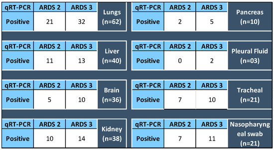 For each organ (total of samples tested for qRT-PCR), the number of positive detected in specimens collected from the autopsy of ARDS 2 and 3 category patients. p value for Fisher’s Exact Test > 0.05.