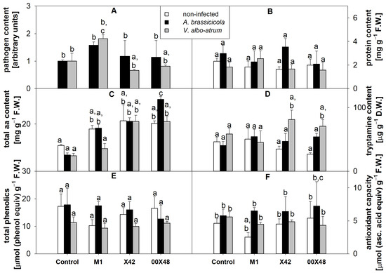 Relative content of A. brassicicola (black columns) and V. albo-atrum (grey columns) determined by RT-qPCR (A); content of total proteins (B); total free amino acids (C); tryptamine (D); total phenolics (E); antioxidant capacity (F) of tomato leaf extracts from plants grown from seeds treated with a Pythium strain (i.e., M1, X42, and 00X48) and from untreated control seeds (Control). Relative pathogen content (A) was expressed to the standard gene actin. Different letters above each bar denote significant differences (p ≤ 0.05) between plant groups according to one-way ANOVA (Holm–Sidak). The same letters above a bar indicate that no significant differences were found among the groups. Each column bar represents the mean ± SD. The degrees of freedom, F-value, and p-values can be found in Table S2. Abbreviations: asc. acid, ascorbic acid; D.W., dry weight; F.W., fresh weight.