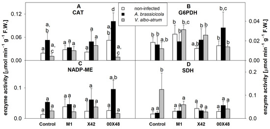 Enzyme activities in tomato leaf extracts from plants grown from seeds treated with a Pythium strain (i.e., M1, X42, or 00X48) and from untreated control seeds (Control): CAT (A); G6PDH (B); NADP-ME (C); SDH (D). Plants were infected with A. brassicicola (black columns) and V. albo-atrum (grey columns), and the results were compared with those of non-infected plants (white columns). Different letters above each bar denote significant differences (p ≤ 0.05) among plant groups according to one-way ANOVA (Holm–Sidak). The same letters above a bar indicate that no significant differences were found among groups. Each column bar represents the mean ± SD. The degrees of freedom, F-values, and p-values can be found in Table S5. Abbreviations: CAT, catalase; F.W., fresh weight; G6PDH, glucose-6-phosphate dehydrogenase; NADP-ME, NADP-malic enzyme; SDH, shikimate dehydrogenase.