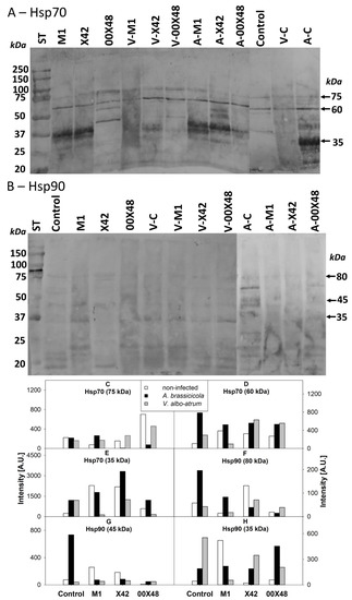 Leaf Hsp70 immunochemical detection on nitrocellulose membranes showed the three most visible isoforms, with molecular weights of 75, 60, and 35 kDa. A. brassicicola had a stronger effect on the abundance of Hsp70 isoforms than V. albo-atrum. For example, in non-treated plants, the 60-kDa isoform was also more abundant in plants infected with A. brassicicola. Some isoforms were also decreased by fungal infection (Figure 8A). Similarly, the three main Hsp90 isoforms of 80, 45, and 35 kDa were followed, and the results showed that, after infection, the levels of most isoforms were lower in leaves from plants treated with M1 and X42 than in infected control leaves. Conversely, the intensity of all Hsp90 isoforms increased in leaves of untreated plants infected with A. brassicicola (Figure 8B).