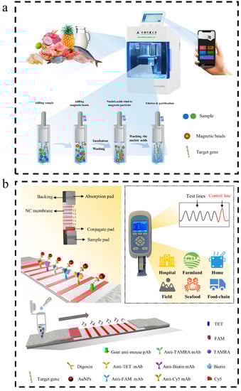 The five reference foodborne strains were cultured in their respective fluid media at 37 °C overnight. The cultures were used to prepare the reference strains of various concentrations. Samples of chicken, pork, beef, milk, shrimp, and fish were purchased from local markets (Hangzhou, China). These samples were certified as negative for five reference foodborne strains according to the bacteriological analytical manual (BAM, Chapter 5, formulated by the Food and Drug Administration) [29]. Each type of meat (25.0 g ± 0.1 g) was homogenized in 225 mL of 4 M NaCl at 8000 rpm for 1 min under sterile conditions. For milk, a 25 mL volume was mixed with 225 mL of buffered peptone water (BPW) (10 g/L peptone, 5 g/L sodium chloride, 9 g/L disodium hydrogen phosphate dodecahydrate, 1.5 g/L potassium dihydrogen phosphate, pH 7.2). After mixing evenly, each homogenate was separately spiked with 104, 103, 102, and 101 CFU/mL of five reference foodborne strains. Subsequently, the genomic DNA from each spiked sample was determined using automatic extraction and purification by collecting, transferring, and releasing magnetic bead steps with a mini automatic nucleic acid extractor (for method refer to Section 2.1).