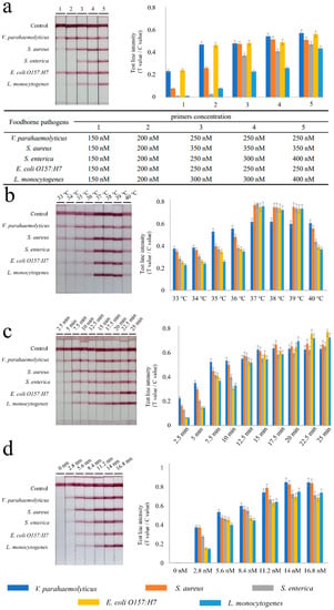 To achieve optimal amplification, critical parameters were used. The entire experiment was repeated three times. After the preliminary experiment, it was found that 25 min incubation was sufficient to observe bands clearly. In the beginning, the concentration of the five foodborne pathogens’ primers was selected at 150 nM. The bands were faintly discernible, as shown in Figure 2a. Hence, the concentration of primers was successively increased (from 150 to 400 nM) and assessed. Finally, the concentration of primers for V. parahaemolyticus was 250 nM, for S. aureus it was 350 nM, for S. enterica it was 400 nM, for E. coli O157:H7 it was 250 nM, and for L. monocytogenes it was 400 nM.