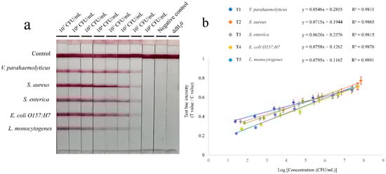 Reaction sensitivity of the RPA-LFIA. (a) Amplification results. The initial concentration of V. parahaemolyticus, S. aureus, S. enterica, E. coli O157:H7, and L. monocytogenes were 2.4 × 107 CFU/mL, 7.1 × 107 CFU/mL, 4.5 × 107 CFU/mL, 5.1 × 107 CFU/mL, and 2.7 × 107 CFU/mL, respectively. After tenfold serial dilution, an equal volume of bacterial solutions in the same concentration level were mixed. The tests were repeated three times. (b) Standard curves. The sensitivity was evaluated with the logarithmic (log10) values ranging from 107 to 100 CFU/mL.