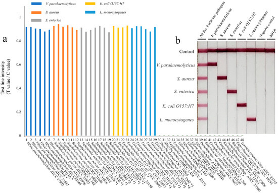 There were 48 common foodborne strains (Table 1) that were selected to evaluate the specificity of the multiple RPA-LFIA assay, including six strains of V. parahaemolyticus, six strains of S. aureus, seven strains of S. enterica, four strains of E. coli O157:H7, six strains of L. monocytogenes, and nineteen other foodborne strains. The DNA from 48 pathogenic bacteria was extracted and added to the RPA reaction to determine the specificity of the multiple RPA-LFIA method. The results (Figure 4a) showed that only 29 targeted foodborne pathogens were positive in testing, and the others were negative. Figure 4b shows that the pathogenic bacteria alone have a clear visual band in the specific detection of the test strips. This indicated that there was no cross-reactivity among the five target genes.