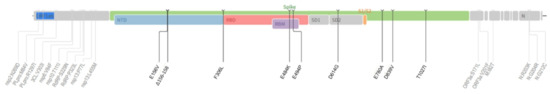 Several mutations in the S region have been observed in the B.1.1.523 variant, from which 156_158del, E484K and S494P are considered as an attribute of VOM (Figure 1). According to previously reported data, the 156_157del and G158R mutations in the Delta variant match the same protein surface area as the 144 and 241–243 deletions in the Alpha and Beta (B.1.351) variants, respectively. These altered residues are found in the NTD ‘supersite’ targeted by most anti-NTD neutralizing antibodies, thus providing a mode to evade the immune system [29]. Moreover, the E484K mutation also contributes to SARS-CoV-2 immune system evasion. Several recent studies have observed that E484K may significantly reduce convalescent serum neutralization [30,31]. Additionally, it was observed that the S494P mutation is related to a 3–5-fold reduced SARS-CoV-2 neutralization in sera. With the combination of the 156_158del, E484K and S494P mutations, as shown in Figure 1, the B.1.1.523 lineage should remain on epidemiologists’ watchlists as one of the concerning SARS-CoV-2 lineages. Moreover, the T1027I substitution in the spike is in a perfectly conserved amino acid strand [32] typical of the former VOC gamma variant (P.1). We cannot find any studies focused on investigating the effect of this mutation. E156V, F306L, E780A and D839V are not typical in other lineages, but are observed in Delta, Omicron, Gamma and other lineages. The total number of sequences published in GISAID with these mutations (13 June 2022) is 615, 2540, 962, and 832, respectively, out of a total of 11.4 million published genomes.