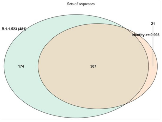 The overlap between the two data sets used for the focused ML tree. The sequences were chosen either based on the Pango assignment or by identity with a B.1.1.523 lineage sequence (EPI_ISL_1590462). Most of the sequences with high identity (>0.993) to the Latvian B.1.1.523 lineage were classified as belonging to B.1.1.523. However, 21 sequences (6%) were not assigned to B.1.1.523.