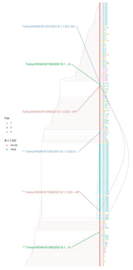 The Turkish sequences assigned to the B.1.1.523 lineage depicted in Figure 5 are highly diverged from the wild type based on the regional variation in the S protein. According to the GISAID Audacity Instant search (performed on 7 October 2021) [4], the first variable region (bottom left, Figure 5) from Turkey/HSGM-B11599/2021 was found in seven sequences, and the second variable region (bottom right, Figure 5) was found in four sequences. The sequences have been deposited into GISAID during several submissions. Other genomic regions of the Turkish sequences shown in Figure 4 do not contain such large SNP clusters as the ones shown in the S protein. This is indicated by the changes in the placement of the three Turkish sequences upon switching the two extremely deviated fragments with corresponding fragments with the reference sequence (the black lines in Figure 5 connect the original sequence variant with the manually changed sequence). The switch to the wildtype fragment for the three sequences changes the placement and they are no longer clustered close to each other. Only one of them after the switch is clearly placed together with other B.1.1.523 sequences.