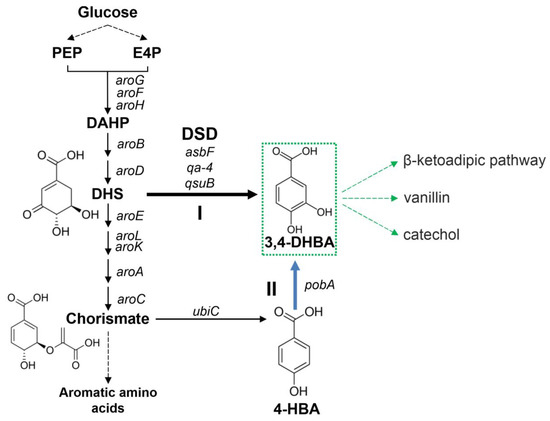 Two routes of 3,4-DHBA biosynthesis (I and II) from glucose. The reactions of common aromatic pathway, which start from condensation of phosphoenolpyruvate (PEP) and erythrose-4-phosphate (E4P) with the formation of 3-deoxy-D-arabino-heptulosonate-7-phosphate (DAHP), are denoted as E. coli gene names. aroG, aroF, aroH—DAHP-synthases; aroB—3-dehydroquinate synthase; aroD—3-dehydroquinate dehydratase; aroE—shikimate 5-dehydrogenase; aroL, aroK—shikimate kinases; aroA—5-enolpyruvylshikimate 3-phosphate synthase; aroC—chorismate synthase. Bold black and blue lines indicated steps catalyzed by heterologous enzymes. asbF, qsuB, qa-4—DSDs investigated in this work. ubiC—chorismate lyase; pobA—4-hydroxybenzoate (4-HBA) 3-monooxygenase.
