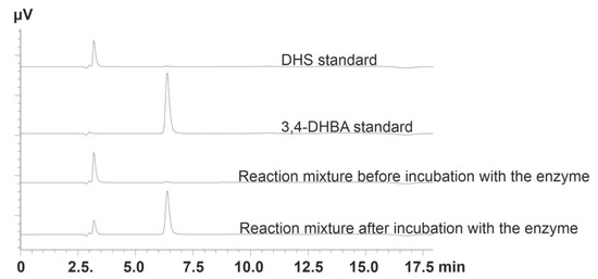 Product identification was performed via comparison of its UV spectrum with that of the 3,4-DHBA standard using a Genesys10S UV-visible spectrophotometer (Thermo Scientific, Madison, WI, USA). The identity of the compounds to DHS and 3,4-DHBA standards was verified using HPLC. For this purpose, ethanol was added to make a concentration of 70% to inactivate the enzyme; the sample was diluted 100-fold in water and filtrated. DHS and 3,4-DHBA standards were purchased from Sigma-Aldrich (St. Louis, MO, USA).