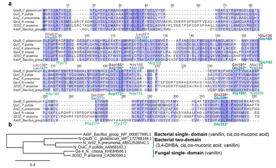 Amino acid alignment (a) and a phylogenetic tree (b) of DSDs used for the microbial production of 3,4-DHBA and the compounds derived from 3,4-DHBA (noted in brackets). Amino acid residues written in green (below the row), red, and blue (above the row) correspond to AsbF, QsuB, and Qa-4 active center residues, respectively. Bold font indicates residues participating in metal binding.
