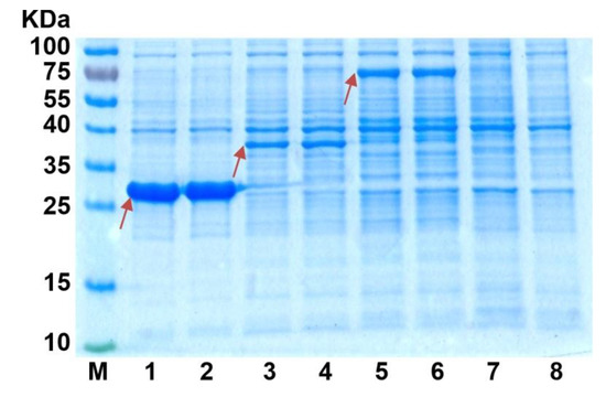 SDS-PAGE of proteins from crude extracts of E. coli BL21(DE3)/pET22b-DSD cells. Red arrows indicate the target protein. Lane: 1–2—AsbF, 3–4—Qa-4, 5–6—QsuB, 7–8—negative control without DSD. (Overall protein concentration was equal to 10 µg in each lane.)