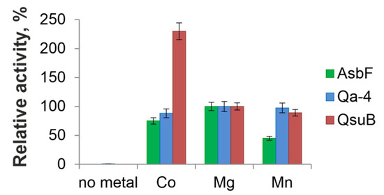 DSDs are metal-dependent enzymes capable of using a range of divalent cations [9,10,27]). QsuB provided maximal activity in the presence of Co2+ [13]. AsbF from B. thuringiensis showed a slight preference for Mg2+ over Co2+ and Mn2+ [10]. Mg2+ provided thermal stability for Qa-4, and Mo2+, Mn2+, Ba2+, and Ca2+ (preference not shown) restored the enzymatic activity inhibited by EDTA [27]. Taking into account published data, the activities of the isolated proteins were tested in the presence of Co2+, Mg2+, and Mn2+. No activity was observed without addition of metal ions for all proteins (Figure 5). AsbF and Qa-4 were more active with Mg2+ ions (Figure 5). The following in vitro experiments were performed with an appropriate metal cofactor for each enzyme.