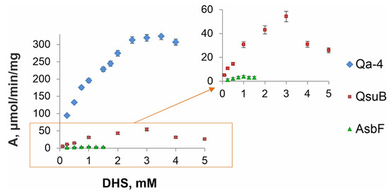 Kinetic curves of DSDs (pH 7.5, 20 °C). The dependence of protein activity on substrate concentration was generated in triplicate. Blue rhombuses represent Qa-4 activity; red squares and green triangles correspond to QsuB and AsbF activities, respectively. The orange frame highlights the area that is magnified in the right graph owing to the considerably higher specific activity of Qa-4 in comparison with that of QsuB and especially with that of AsbF.