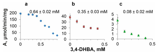 The inhibition of an enzyme by the reaction product is an important characteristic to obtain this product using microbial synthesis. In our previous studies, QsuB inhibition by 3,4-DHBA was investigated, and a noncompetitive inhibition mechanism was established [13]. Thus far, AsbF and Qa-4 have not been characterized in terms of 3,4-DHBA inhibition. However, these enzymes were also found to be inhibited by 3,4-DHBA (Figure 7). For comparison, 3,4-DHBA half-maximal inhibitory constants (IC50) of the investigated DSDs were determined (indicated in Figure 7). AsbF was the most sensitive to 3,4-DHBA addition. This enzyme lost more than half of its catalytic activity when 0.1 mM 3,4-DHBA was added. Qa-4 maintained its activity and was practically unchanged up to 0.4 mM 3,4-DHBA (a decrease of <10%). QsuB demonstrated significant loss of activity (~42%) at 0.2 mM 3,4-DHBA.