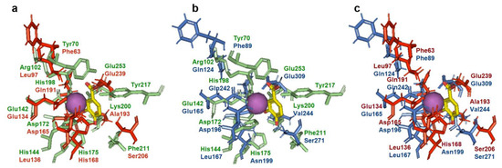 Pairwise active site superimposition of AsbF, QsuB, and Qa-4. 3,4-DHBA and Mn2+ were modeled in from the AsbF crystal structure (PDB ID: 3DX5) and is depicted in yellow and as purple sphere, respectively. The residues in green, blue, and red correspond to AsbF, Qa-4, and QsuB, respectively. AsbF crystal structure (PDB ID: 3DX5) and 3D models of QsuB and Qa-4 were used. (a) AsbF and QsuB, (b) AsbF and Qa-4, (c) QsuB and Qa-4.