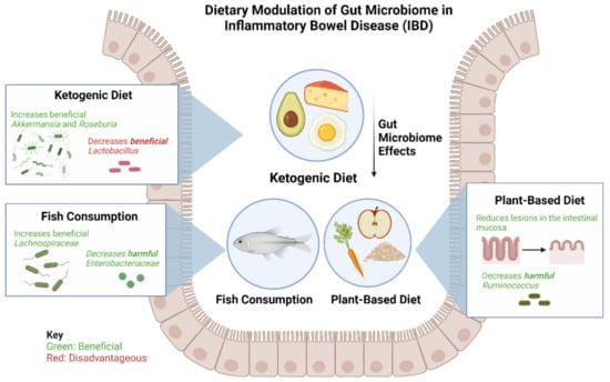 Effects of a ketogenic diet, plant-based diet, and fish consumption on gut microbiome in patients with IBD. The ketogenic diet has been shown to increase beneficial bacteria Akkermansia and Roseburia and consequently decrease beneficial Lactobacillus. The plant-based diet has been found to be beneficial in reducing lesions of the intestinal mucosa and reducing harmful Ruminococcus. Fish consumption leads to an increase in beneficial Lachnospiraceae and a decrease in harmful Enterobacteriaceae.