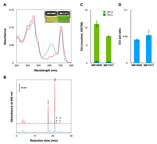 Comparison of cellular pigments between two Acaryochloris strains. (A) In vivo cellular spectra of A. marina MBIC10699 (red) and A. marina MBIC11017 (blue). Inset: picture of each culture. (B) HPLC profile of total pigments extracted with methanol from cells of A. marina MBIC10699 (red) and A. marina MBIC11017 (blue) monitored by absorption at 440 nm. Each arrow indicates zeaxanthin (1), Chl d (2), Chl a (3), and α-carotene (4), respectively. (C) The amounts of Chl a (dark green) and Chl d (green) were measured in two Acaryochloris strains. (D) The ratio of cellular Chl a/d amounts in the two Acaryochloris strains.