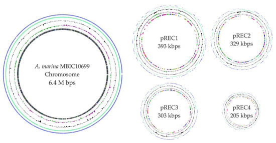 For the genome assembly, pre-processed short reads and long reads were hybrid assembled using Flye 0.2.8 [14]. The output of Flye was polished using Pilon [15] three times, generating a single circular sequence for the chromosome and another four circular plasmid sequences. The chromosome sequence was rotated to the first nucleotide of the 100 bp upstream of the dnaA gene. The genome sequence was then annotated using the annotation pipeline DFAST 1.5.0 [16] provided by DDBJ. DFAST automatic annotation predicted 6800 coding sequences and 6 rRNA genes and 72 tRNA genes. The sequencing depth of the chromosome and four plasmid sequences were calculated using BBmap (BBMap-Bushnell B.-sourceforge.net/projects/bbmap/, accessed on 15 March 2021). The complete genome sequence and annotation of A. marina MBIC10699 was deposited at DDBJ under accession numbers AP026075 (Chr), AP026076 (pREC1), AP026077 (pREC2), AP026078 (pREC3), and AP026079 (pREC4). Raw sequencing data were deposited in the DDBJ SRA database under BioProject number PRJDB13468 and BioSample number SAMD00467986.