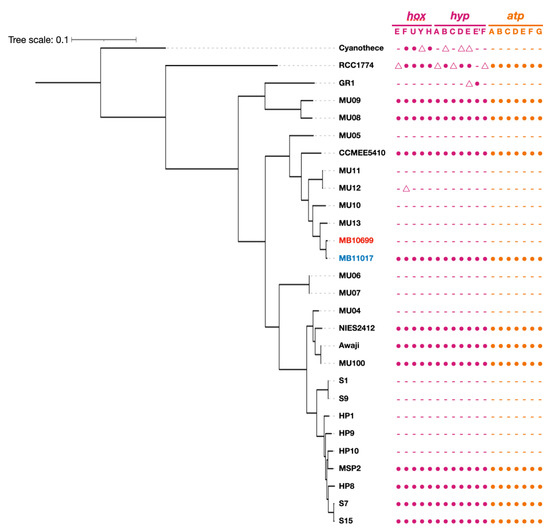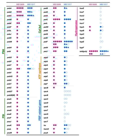Comparison of the number of gene paralogs related to photosynthesis and electron transfer systems. The number of paralogs of genes related to photosystem I (psa), photosystem II (psb), cytochrome b6f and electron transfer (pet), ATP synthase (atp), PBP, and hydrogenase are indicated by the number of red (A. marina MBIC10699) and blue (A. marina MBIC11017) symbols. Circles indicate completely identical amino acid sequences between the two strains and triangles indicate that the homology is not 100% (shown in A. marina MBIC11017). Filled circles indicate genes encoded by chromosome and empty circles indicate plasmid-encoded genes.