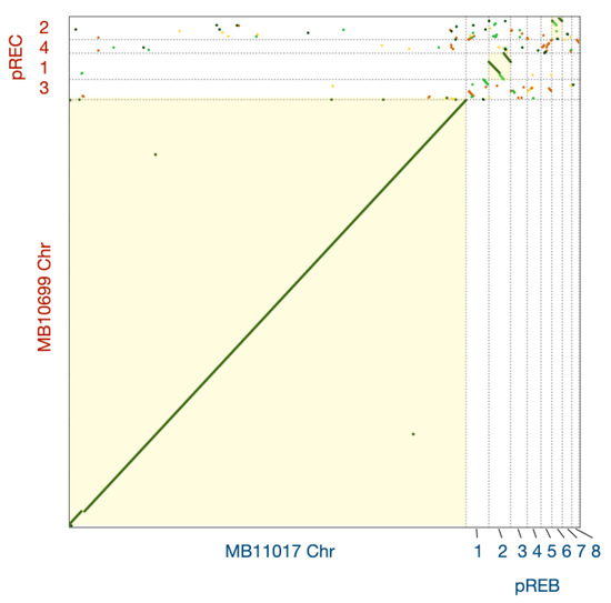 Dot plot analysis between A. marina MBIC10699 and MBIC11017. Dot plot alignment of A. marina MBIC10699 (vertical axis) versus A. marina MBIC11017 (horizontal axis). The color of each dot indicates the degree of identity, with 75% or more represented by green, 75–50% by light green, 50–25% by brown, and 25% or less by yellow, respectively. Matrices of combinations in which significant homology was detected are highlighted in light yellow.